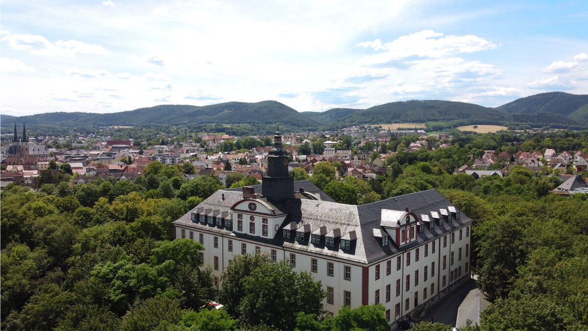 Am 29. März 1677 wurde der Grundstein für das Residenzschloss Saalfeld auf dem Petersberg der Stadt Saalfeld gelegt. Der Schlossbau und die Errichtung eines Residenzquartiers dauerte fast 50 Jahre. Zunächst wurde unter Baumeister Johann Wilhelm Gundermann der Mitteltrakt des Schlosses mit zwei kurzen Seitenflügeln errichtet. Die Bekrönungssteine auf den Giebeln des Mitteltraktes enthalten die Jahreszahl 1682.