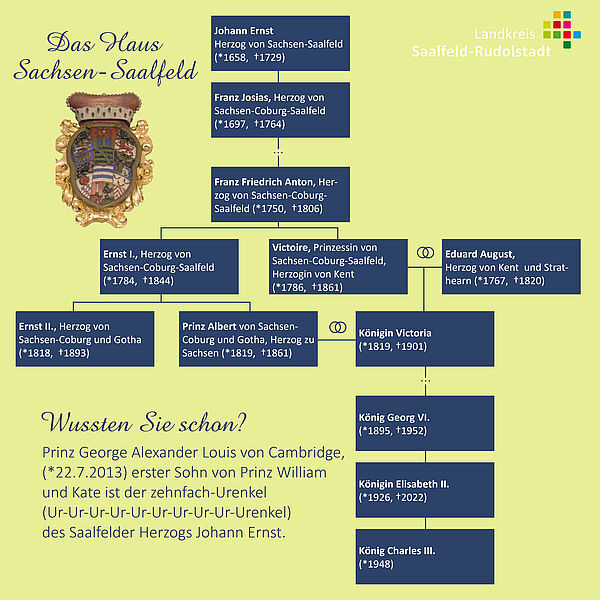 Wussten Sie schon? Prinz George Alexander Louis von Cambridge (*22. Juli 2013), erster Sohn von Prinz William und Prinzessin Kate, ist der zehnfache-Urenkel des Saalfelder Herzogs Johann Ernst.