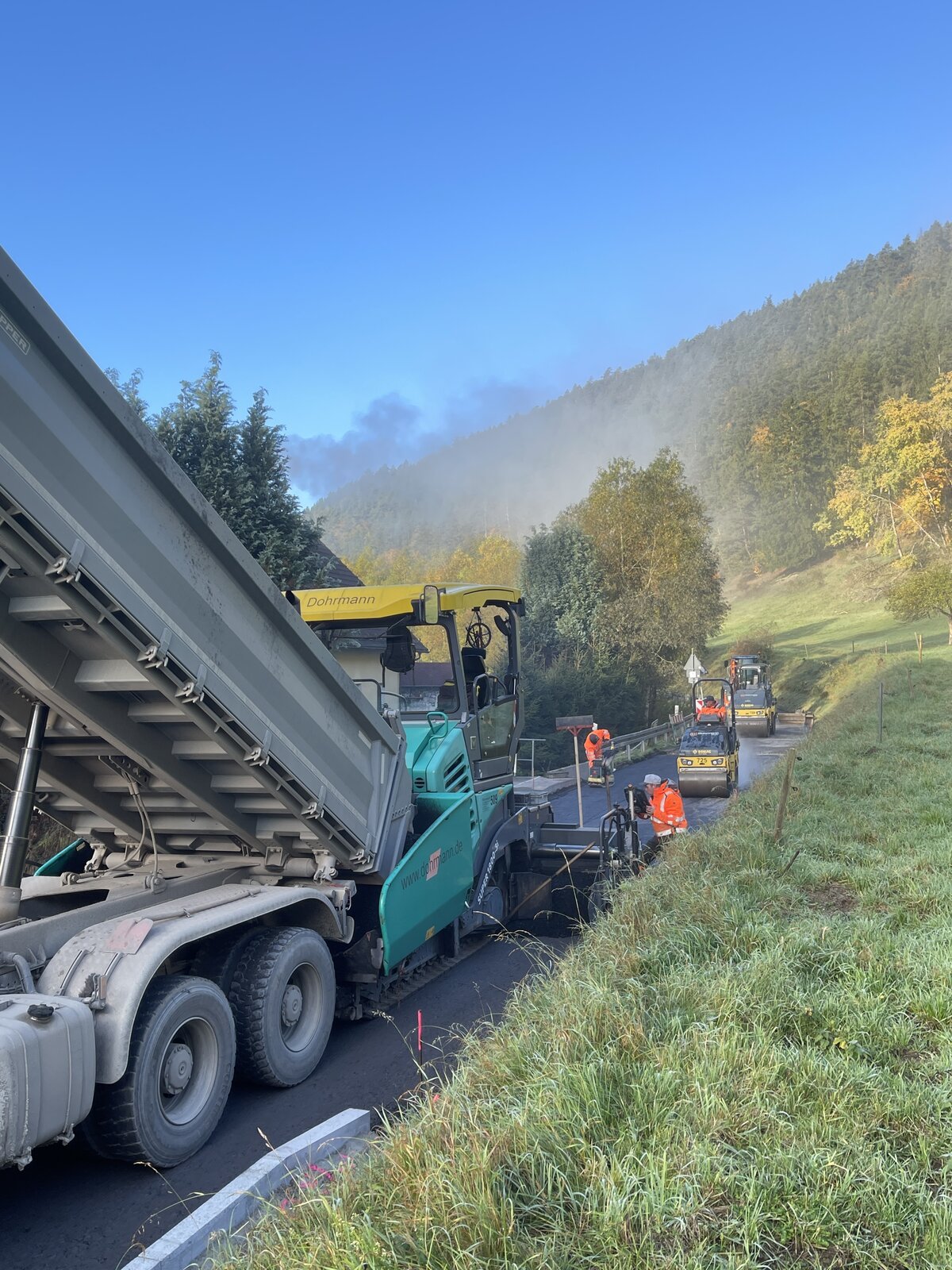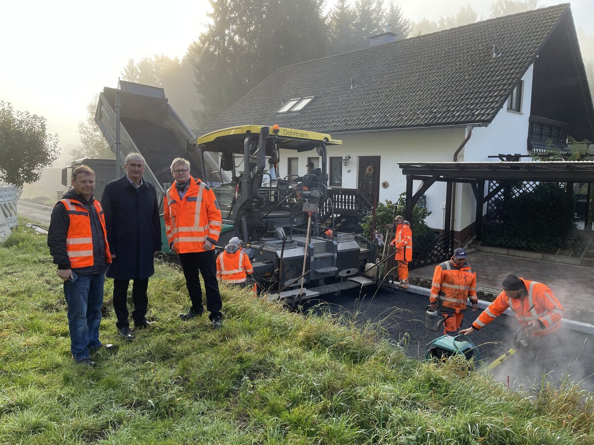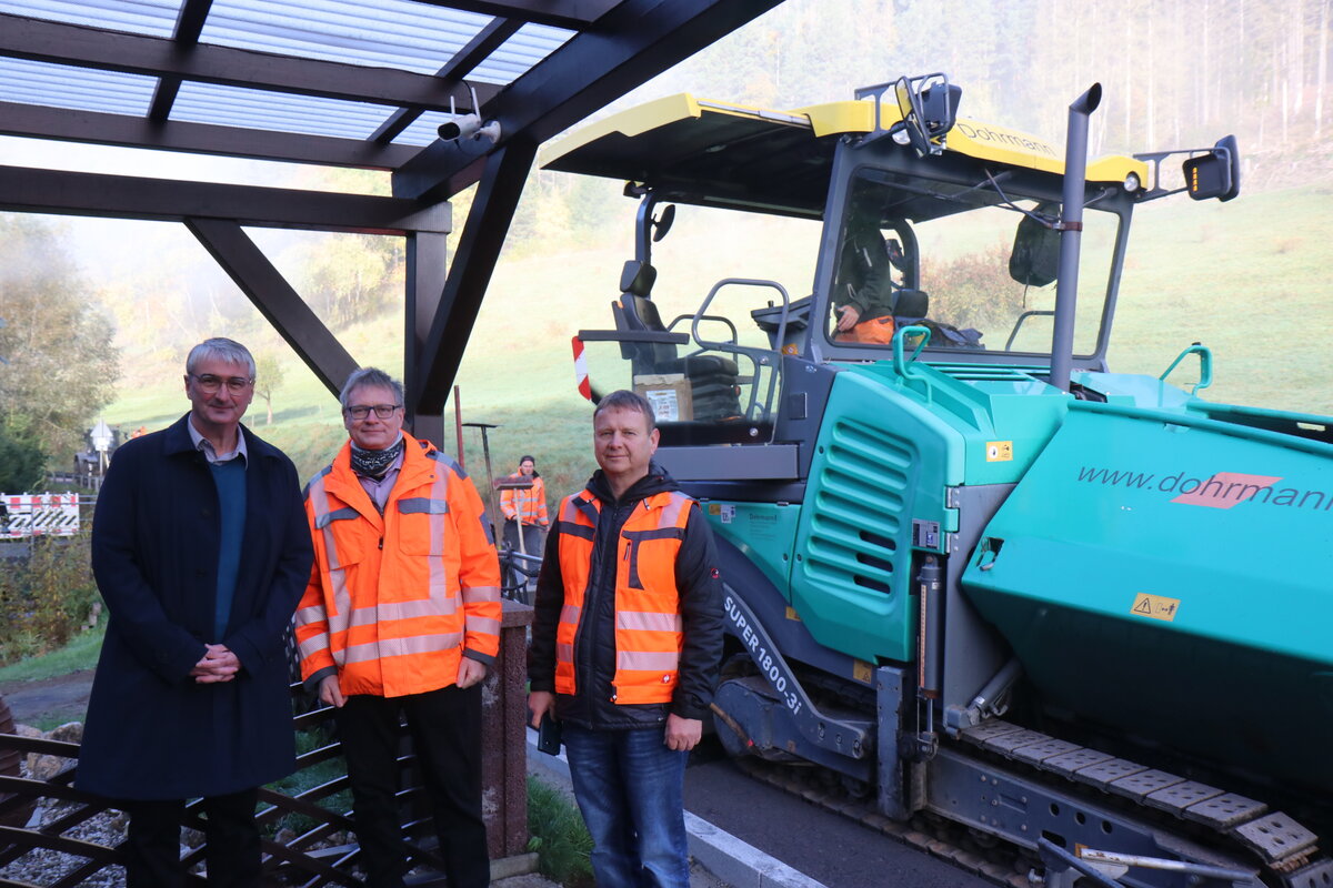 Gräfenthal. In Gräfenthal geht die größte Straßenbaumaßnahme des Landkreises dem Ende zu: am Dienstag, 14. Oktober, wurde der rund 850 Meter lange Straßenabschnitt der Meernacher Straße (K175) asphaltiert. Landrat Marko Wolfram machte sich gemeinsam mit Marko Schönheyd, Sachgebietsleiter Tiefbau im Landratsamt und Kai Sommer als zuständigem Sachbearbeiter ein Bild vom Aufbringen der 16 Zentimeter starken Tragschicht. Rund 4,2 Millionen Euro kostet die Baumaßnahme, die in drei Abschnitten zwischen 2023 und 2025 umgesetzt wurde. Etwa 1,8 Millionen Euro beträgt der Anteil des Landkreises.