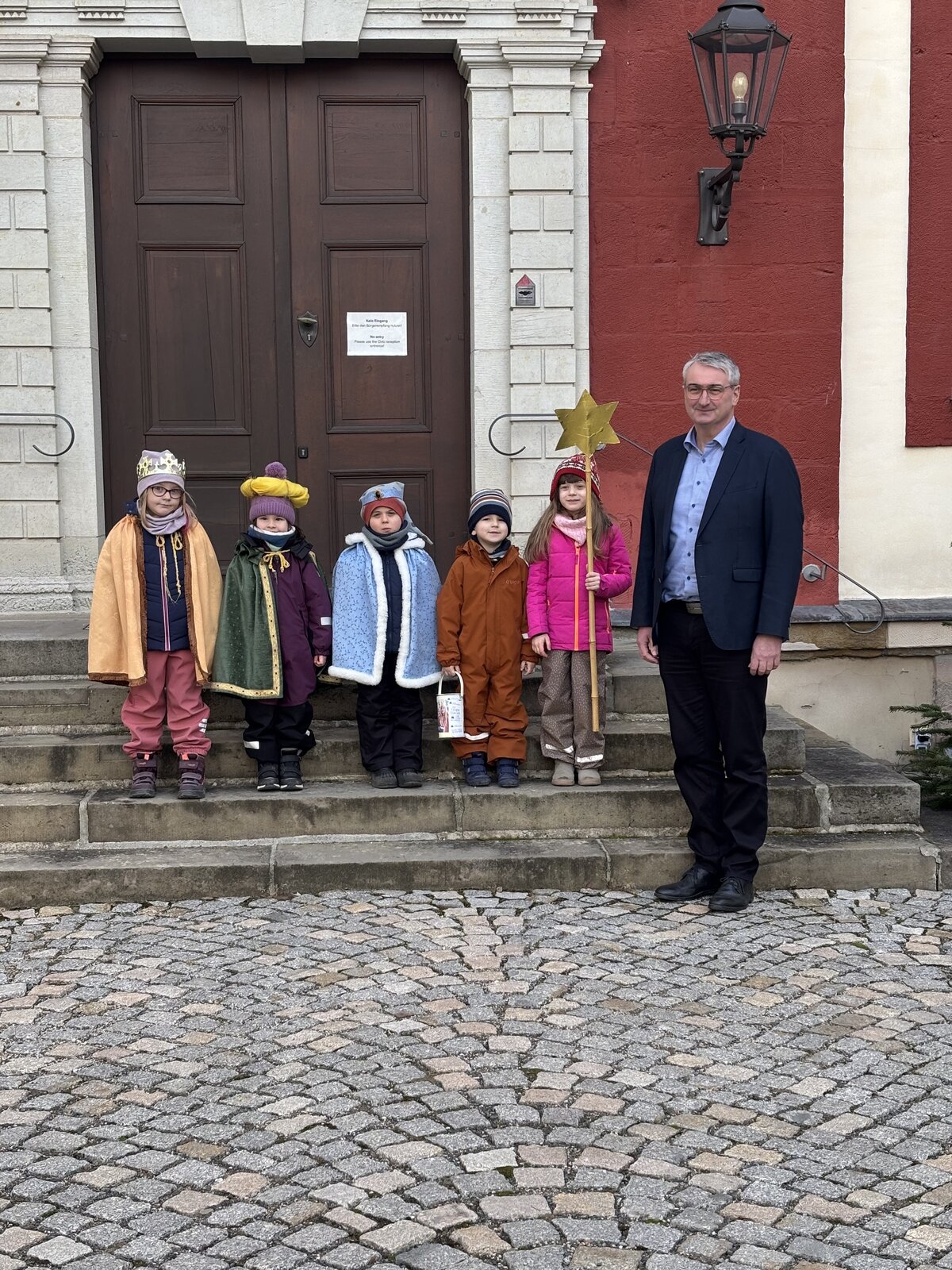 Foto der Sternsinger mit Landrat Marko Wolfram am Eingang des Saalfelder Schlosses - Foto: Franziska Ehms/Tarja Gedeon