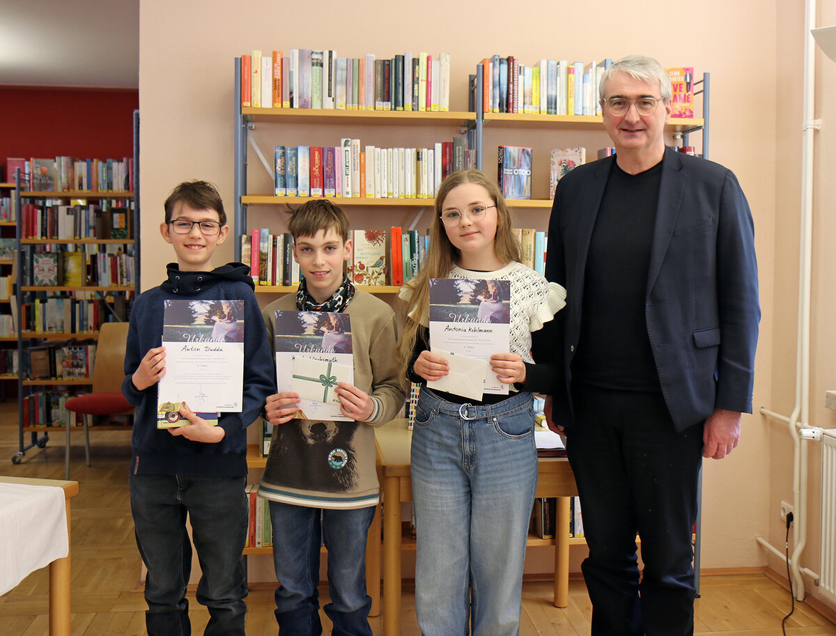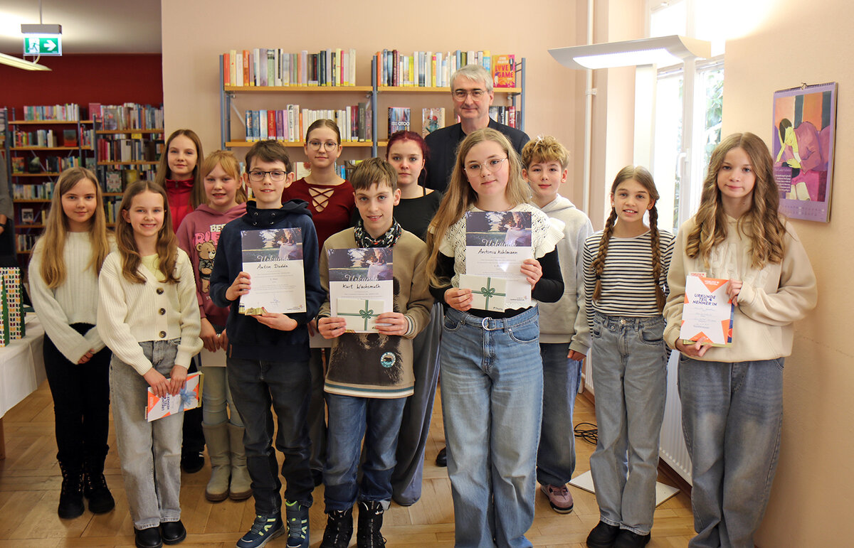 Saalfeld. Antonia Kohlmann vom Gymnasium Fridericianum Rudolstadt hat den 67. Vorlesewettbewerb für den Landkreis Saalfeld-Rudolstadt am heutigen 4. Februar 2026 gewonnen. Den zweiten Platz belegte Kurt Wachsmuth vom Dr. Max Näder Gymnasium Königsee, Dritter wurde Anton Dudda von der Regelschule Neusitz. Insgesamt traten 12 Schülerinnen und Schüler der Klassenstufe sechs des Landkreises in der Stadtbibliothek Saalfeld gegeneinander an. Die Wettbewerbsteilnehmer waren als Gewinner aus den Schulausscheiden hervorgegangen.