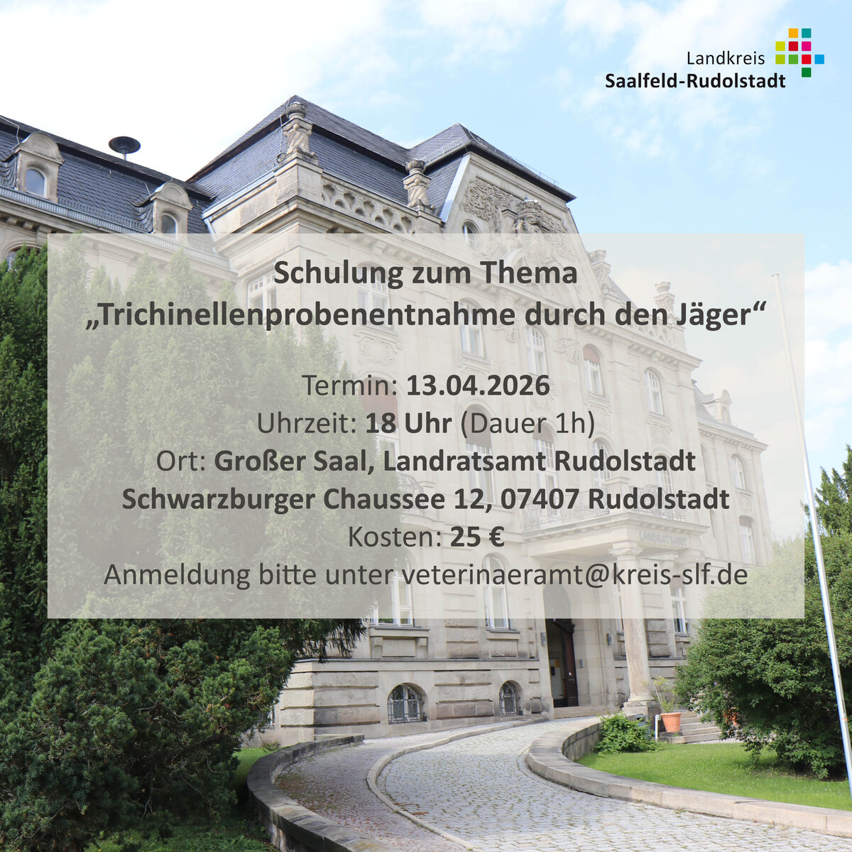 Rudolstadt. Das Veterinär- und Lebensmittelüberwachungsamt des Landkreises Saalfeld-Rudolstadt lädt interessierte Jägerinnen und Jäger am 13. April 2026 zu einer Schulung zum Thema „Trichinellenprobenentnahme durch den Jäger“ im Großen Sitzungssaal des Landratsamtes in Rudolstadt, Schwarzburger Chaussee 12, ein. Die Schulung findet von 16 Uhr bis 17 Uhr statt. Die Kosten betragen 25 Euro, die vor Ort passend in bar zu begleichen sind. Anmeldungen sind per Mail mit Namen, Adresse und Geburtsdatum an veterinaeramt@kreis-slf.de erwünscht.