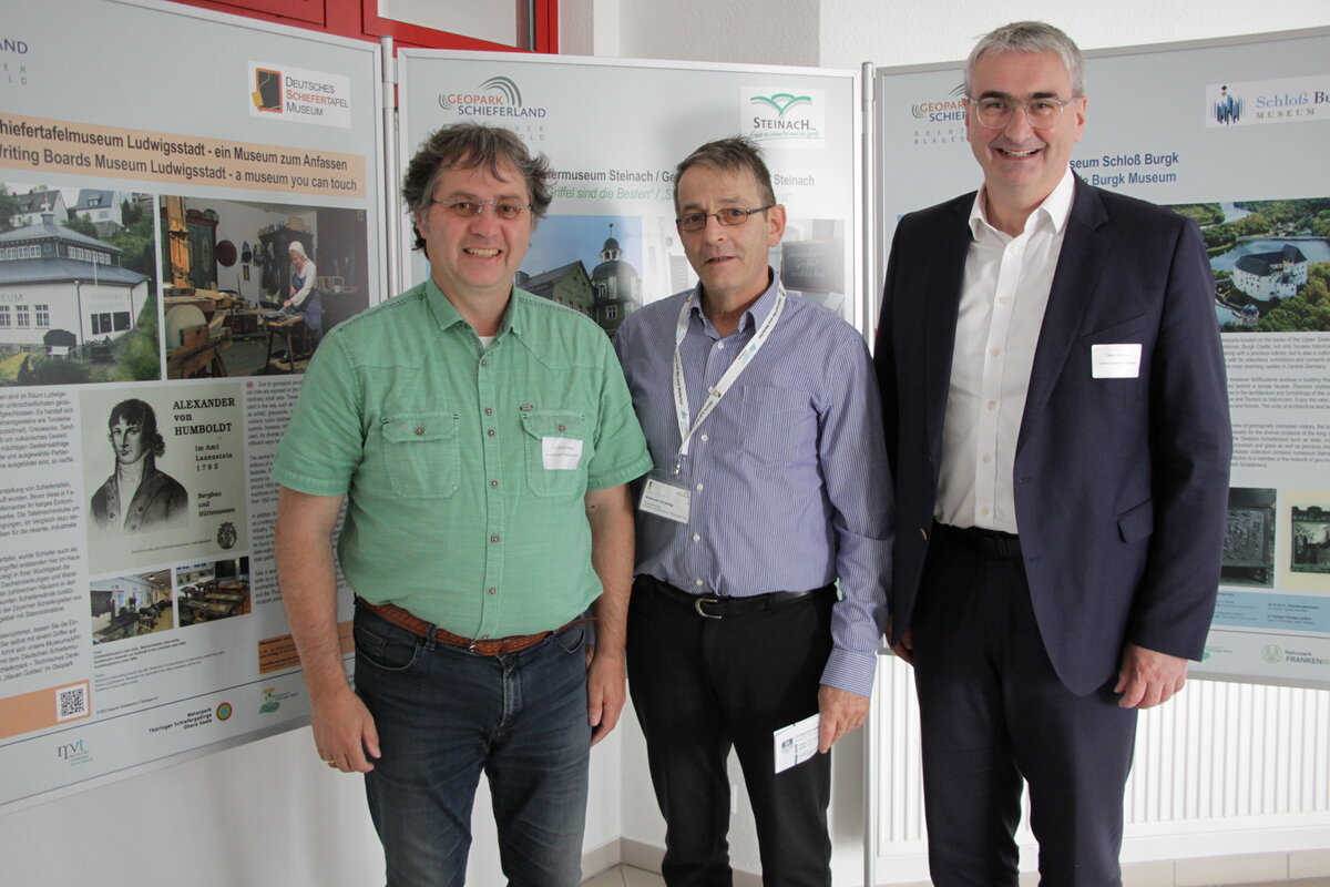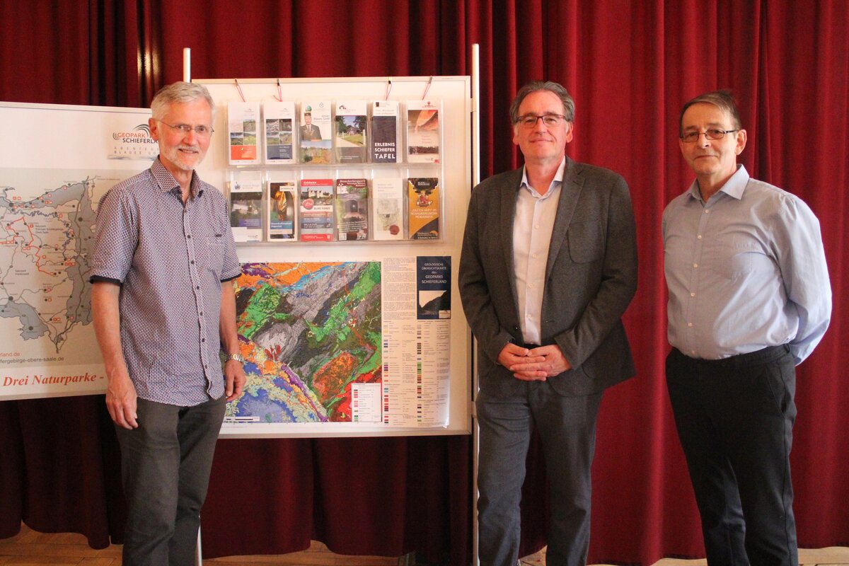 - Der Geopark Schieferland und das Haus des Volkes als Gastgeber - Der Geopark Schieferland mit Probstzella und Haus des Volkes waren im Juni 2024 Veranstaltungsort für die Jahreshauptversammlung des Thüringischen Geologischen Vereins. Im Bild TGV-Vorsitzender Prof. Christoph Heubeck mit dem damaligen Probstzellaer Bürgermeister Sven Mechtold und Geopark-Geschäftsführer Andreas Gliesing (v.-i.)