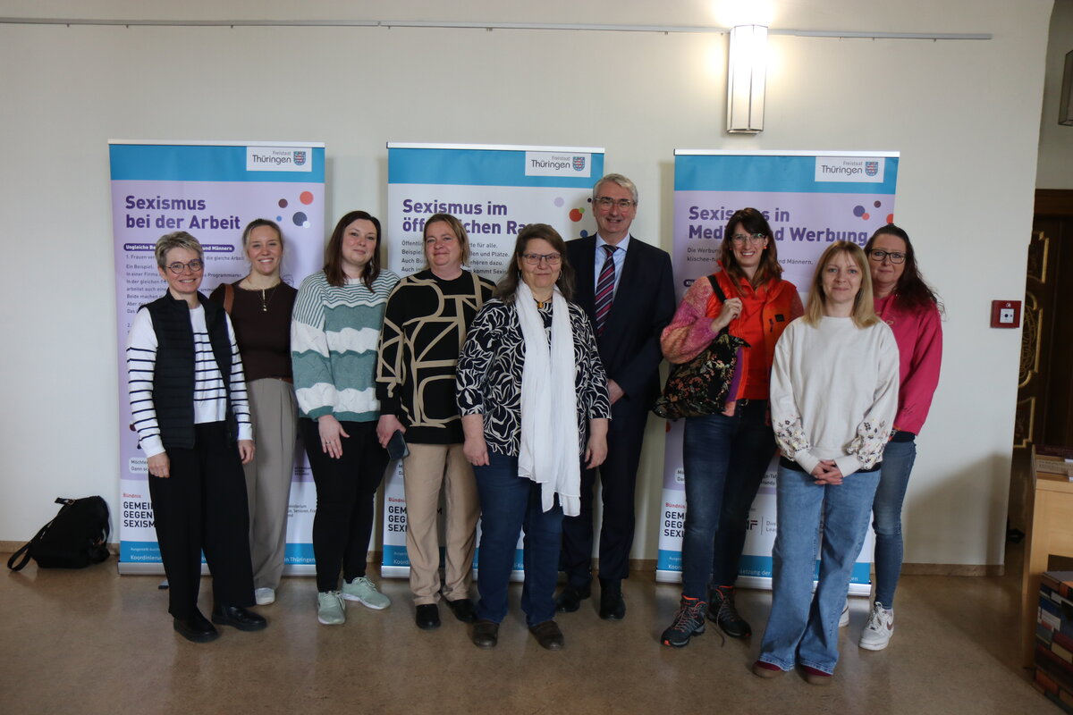 Saalfeld. Landrat Marko Wolfram und die Gleichstellungsbeauftragte des Landkreises, Beate Breuer, haben heute Morgen in der Galerie im Saalfelder Schloss die neue Ausstellung „Gemeinsam gegen Sexismus“ eröffnet. Beate Breuer konnte die Roll-Up-Wanderausstellung der Koordinierungsstelle zur Umsetzung der Istanbul-Konvention in Thüringen bis zum 21. Mai für den Landkreis sichern. Damit möglichst viele Menschen sich mit dem Thema beschäftigen, will sie Schulen und Einrichtungen motivieren, die Ausstellung im Landratsamt mit Gruppen zu besichtigen.