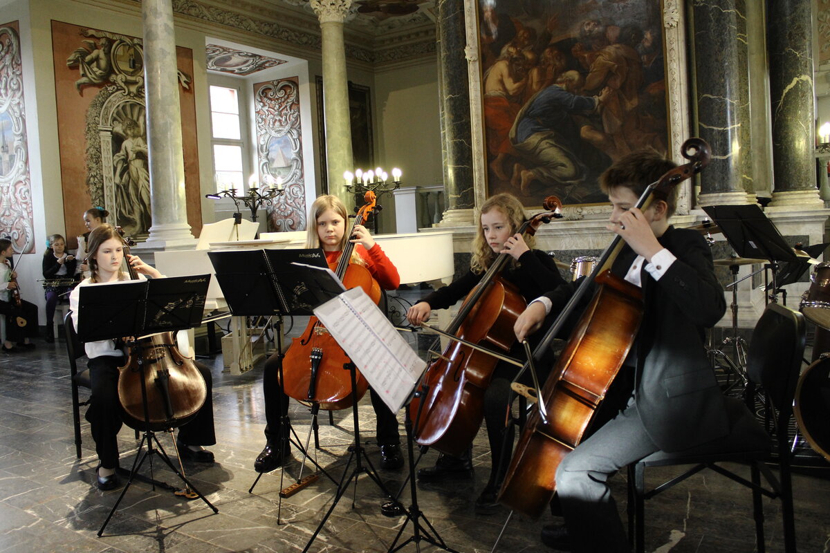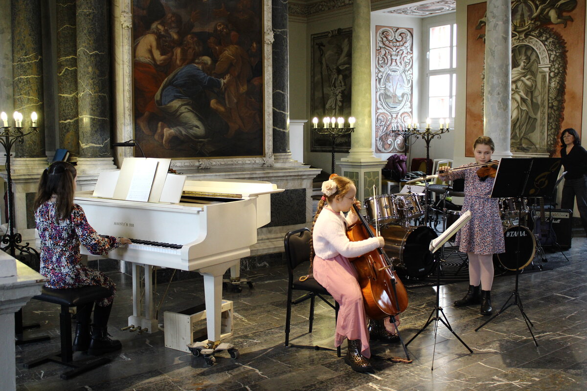 Für manche war es auch bereits eine erste Rückkehr in die Schlosskapelle – wie für das Klaviertrio von Lehrerin Eva-Maria Küßner. Ihr Trio spielte „Jeannies Blue E’en“. Luise Schröder an der Violine, Frida Schrempf am Violoncello und Eva Rossow am Klavier hatten erst im November des vergangenen Jahres hier an gleicher Stelle einen großen Auftritt – sie begleiteten damals die Ehrenamtsgala des Landkreises in der Schlosskapelle.