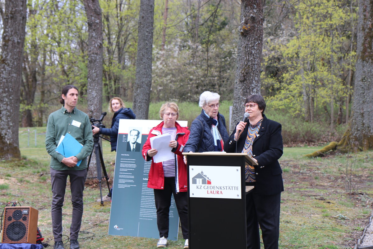 Wolfram erinnerte an die Schicksale der ehemaligen Häftlinge Herman van Hasselt, Auguste Verfaille, Albert Duprat, Ryszard Kessler, Paul Adgé. Als Überlebende der Haft konnten sie ihre Erlebnisse schriftlich oder bei Besuchen überliefern. „Mindestens 560 Menschen haben diesen Ort nicht überlebt - und konnten auch ihre Geschichte nie erzählen. So wie der Ukrainer Juchim Lisenko, der am 8. Dezember 1943 hier in Laura starb oder der Italiener Antonio Colluci, dessen Leben ebenfalls hier, im Fröhlichen Tal, ein Ende fand. Beide Namen finden wir im Totenbuch der Gedenkstätte“, sagte Wolfram. „Wir stehen heute hier, um an sie alle zu erinnern“, betonte der Landrat.