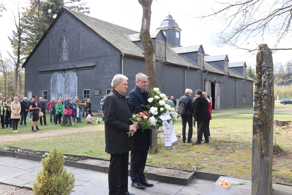 Besonders würdigte der Landrat die positive Entwicklung bei Besuchen durch Schulklassen. Regelmäßig sind inzwischen auch Schulen aus dem benachbarten Landkreis Kronach in Bayern zu Gast in Schmiedebach. „Es ist mir deshalb eine besondere Ehre und Freude, dass mein Freund und Amtskollege, Landrat Klaus Löffler, heute an unserer Gedenkveranstaltung teilnimmt. Unsere Landkreise sind seit 1990 partnerschaftlich verbunden. Mit dem Besuch heute fügen wir dieser Partnerschaft ein weiteres Kapitel hinzu“, sagte Wolfram.